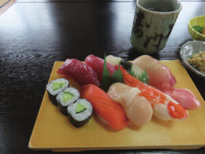 勉強をした後はお待ちかねのランチ。米沢市関根の山の中にある大人気の「大門寿司」へ。このお店は当初から、福島県浪江町からの避難者の支援をしていただいているご主人が経営しているお店です。